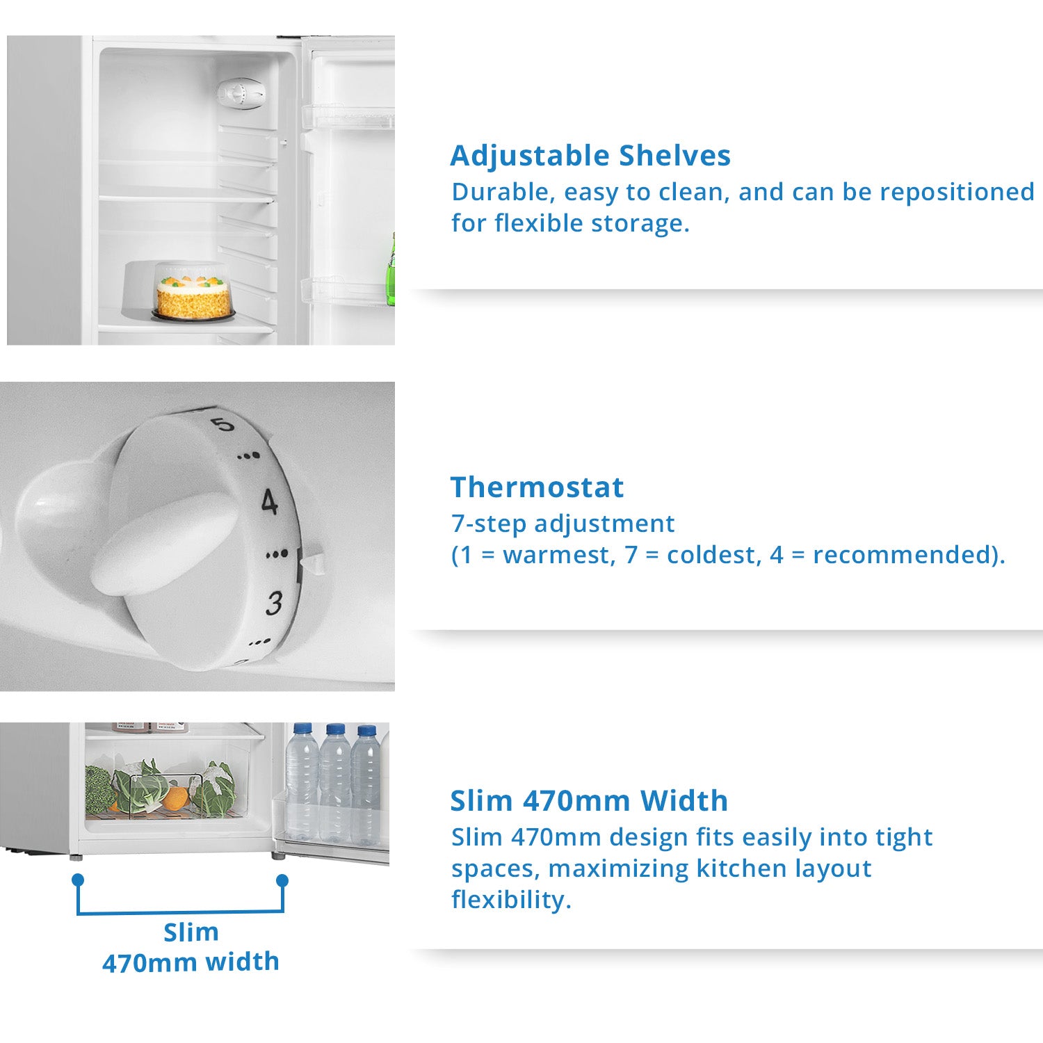 ➭ Door: Reversible door swing for flexible placement. ➭ Interior Lamp: Provides clear visibility inside the fridge; replaceable bulb (Max. 10W). ➭ Compact Design: 470mm width fits comfortably in modern kitchens and small apartments. ➭ Adjustable Glass Shelves: Durable, easy to clean, and can be repositioned for flexible storage. ➭ Manual Thermostat Control: 7-step adjustment (1 = warmest, 7 = coldest, 4 = recommended). ➭ Eco-Friendly Refrigeration: Uses R600a refrigerant and Cyclopentane insulation, both ozone-friendly. ➭ Manual Fast-Freezing Control: Easily activate by turning the thermostat to level 7 for accelerated freezing. |