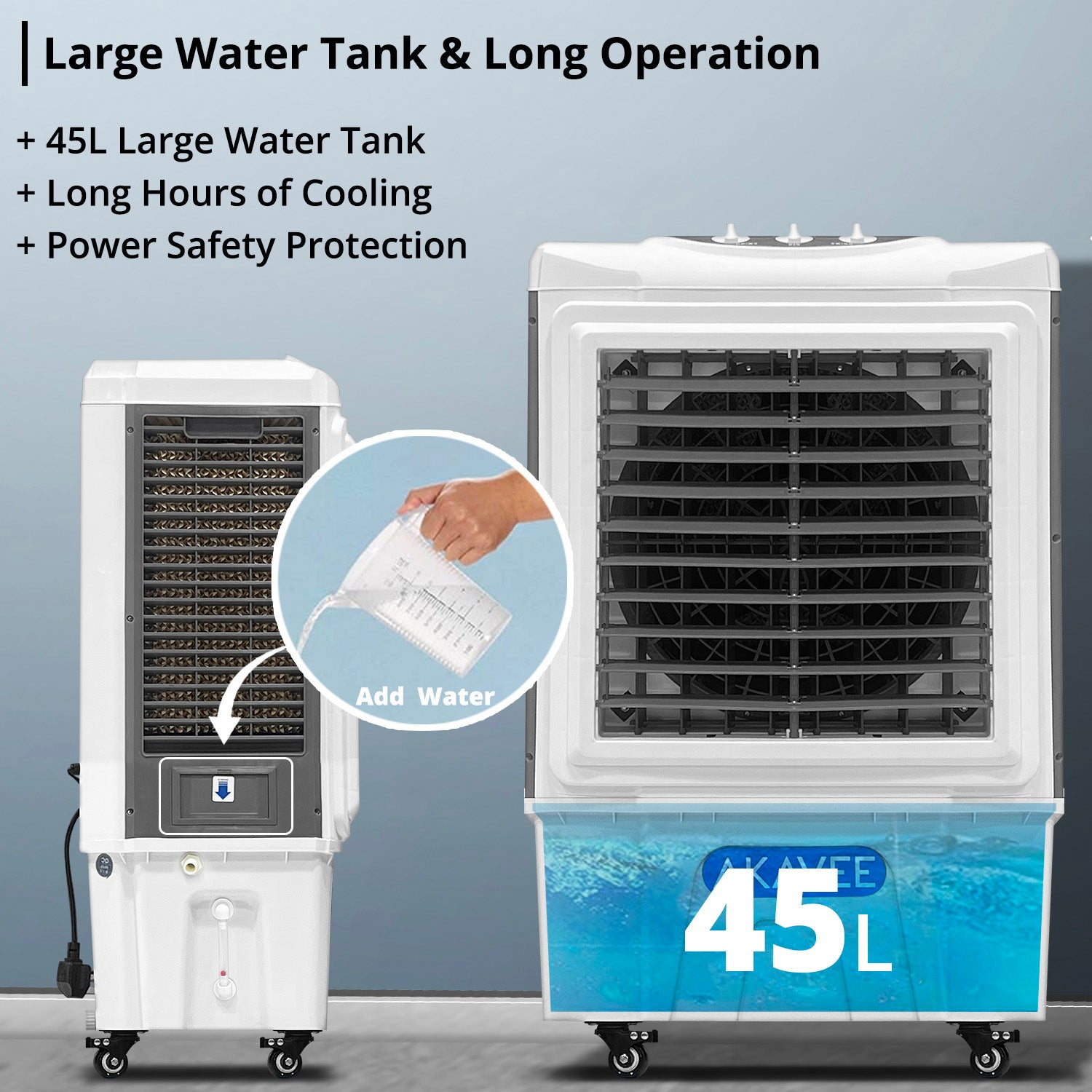 ➭ Suitable for areas around 20–30 m³. ➭ Power safety protection for safer usage. ➭ Air purification effect to help improve air quality. ➭ Strong and durable PP plastic body construction. ➭ Manual control panel, simple and easy to operate. ➭ Multi-angle airflow for fresh and comfortable cooling. ➭ 100% copper motor for durability and long service life. ➭ Low noise operation (≤50dB) for quiet and comfortable use. ➭ Large 45-liter water tank for long hours of continuous cooling. ➭ Large and thick cooling pad for stronger and cooler airflow output. ➭ Three-side air intake design for improved airflow and faster cooling. ➭ Multi-layer honeycomb fiber cooling pad for better water absorption. ➭ Powerful evaporative air cooler with maximum airflow up to 5000 m³/h. ➭ Specially designed durable fan blade with waterproof motor protection. ➭ Equipped with 4 casters, including 2 lockable wheels, for easy movement and stability. ➭ Auto horizontal swing (left–right) & manual vertical swing (up–down) for optimal air distribution. |