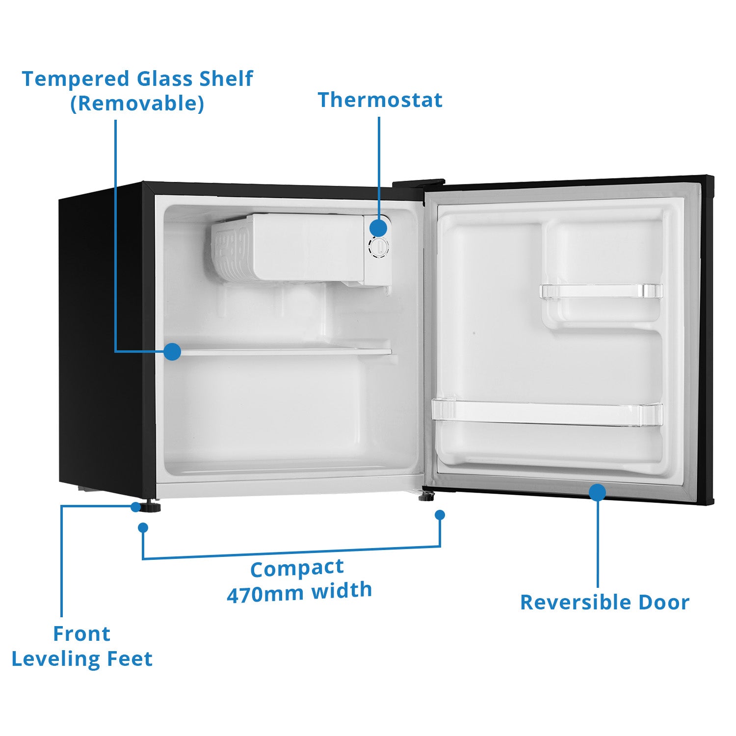 ➭ Sleek black finish complements any décor. ➭ Reversible door allows left or right opening. ➭ Flat-back design for space-saving placement. ➭ Adjustable front feet for stability on uneven surfaces. ➭ Mechanical thermostat for simple temperature control. ➭ Removable glass shelf for easy cleaning and flexible storage. ➭ Compact 470mm (18.5 in) width ideal for dorms, offices, or tight spaces. |