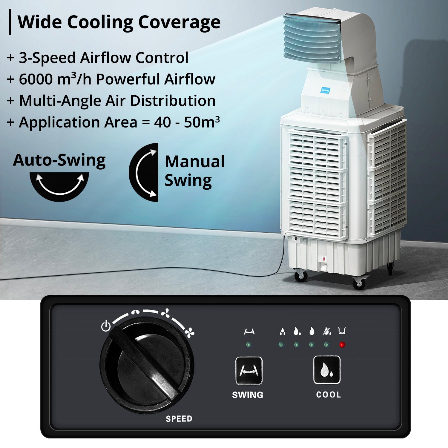 ➭ Suitable for areas around 40–50m³. ➭ Power safety protection for safer usage. ➭ Air purification effect to help improve air quality. ➭ Strong and durable PP plastic body construction. ➭ Manual control panel, simple and easy to operate. ➭ Multi-angle airflow for fresh and comfortable cooling. ➭ 100% copper motor for durability and long service life. ➭ Low noise operation (≤55dB) for quiet and comfortable use. ➭ Large 50-liter water tank for long hours of continuous cooling. ➭ Large and thick cooling pad for stronger and cooler airflow output. ➭ Four-side air intake design for improved airflow and faster cooling. ➭ Multi-layer honeycomb fiber cooling pad for better water absorption. ➭ Powerful evaporative air cooler with maximum airflow up to 6000 m³/h. ➭ Equipped with 4 casters, including 2 lockable wheels, for easy movement and stability. ➭ Auto horizontal swing (left–right) & manual vertical swing (up–down) for optimal air distribution. |