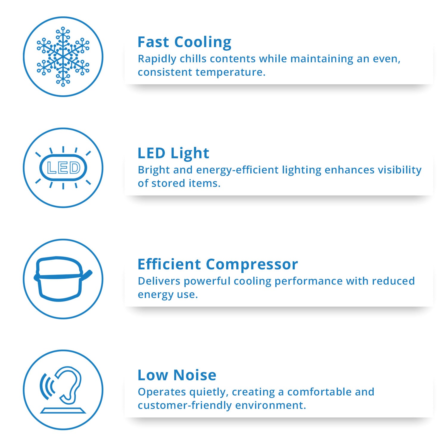 Features: Refrigerant: Eco-friendly R290 (100g). Compressor: High-efficiency, low-noise operation. Design: Durable black exterior with outer handles. Security: Lock & 2 keys included for secure storage. Climate Class: T Class – designed for tropical conditions. Shelves: 4 adjustable wire shelves for flexible arrangement. Temperature Control: Mechanical thermostat, easy to adjust Capacity: 730 liters, ideal for commercial storage and display. Doors: 2 lockable double-tempered glass doors for visibility and security. Cooling System: No Frost with fin evaporator for consistent temperature. Lighting: Dual Interior LED lights for product visibility, plus a top light box for enhanced display. |